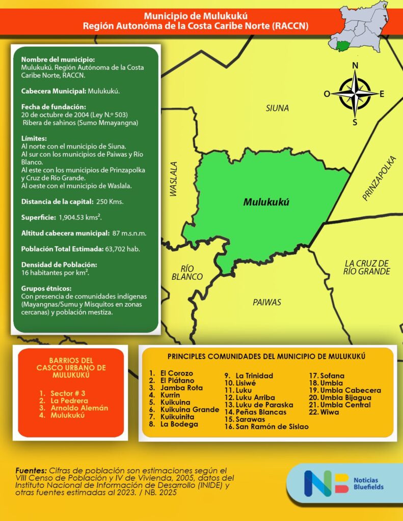 La cabecera se organiza en barrios como Sector #3, La Pedrera y Arnoldo Alemán, espacios que concentran la vida comercial, educativa y social de la ciudad de Mulukukú. Alrededor de la zona urbana se extienden numerosas comunidades rurales como El Corozo, El Plátano, Kurrin, Kuikuina Grande, Sarawas, San Ramón de Sislao, Umbla, Luku Arriba y Wiwa, entre otras, donde la agricultura, la ganadería y la vida en familia siguen siendo los ejes de la cotidianidad.