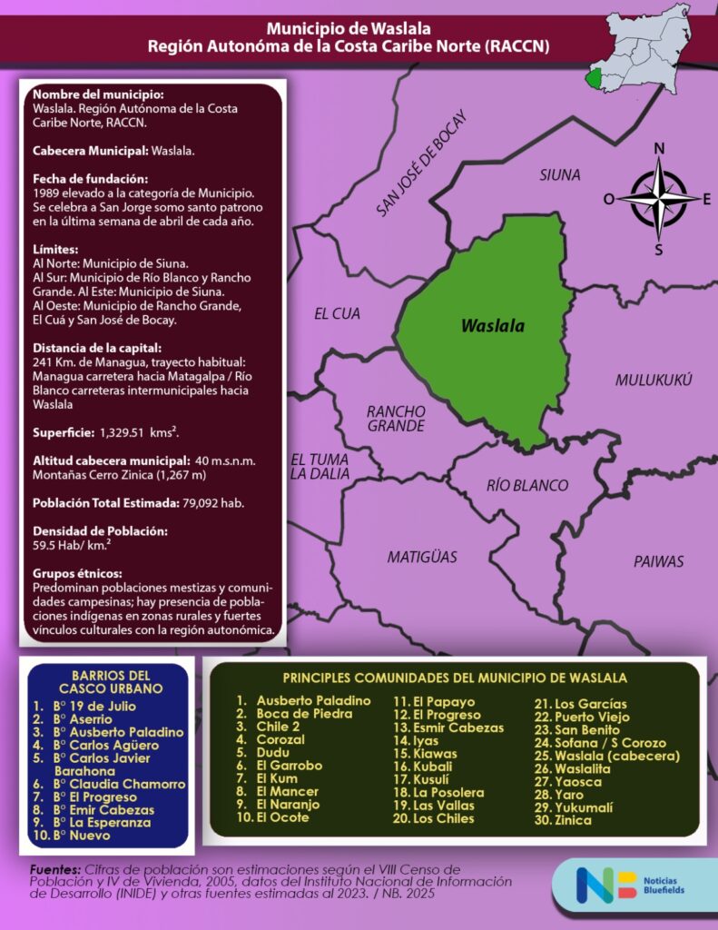 Sin embargo, su gente, sus montañas y su ubicación estratégica continúan posicionando a Waslala como un municipio clave del Caribe Norte, donde el trabajo agrícola, la fe y la identidad campesina siguen moldeando el presente y el futuro del territorio.